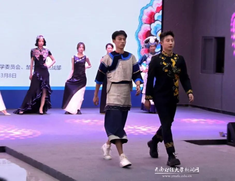 活动期间,由学校教职工和学生组成的模特队伍身着精美的彝绣服饰,以走秀的方式展现了彝族服饰的独特魅力。色彩浓烈、技法粗犷、配色大胆的彝族服饰,享有“绣在身上的神话,穿在身上的历史”美誉,是彝族儿女必不可少,热爱崇尚的节日盛装。相较于传统绣服,现场展示的彝绣服饰在色彩针法、款式、面料上进行了改良,兼顾传统和时尚、古老与现代,为师生们呈现了一场精彩的“T台”秀。