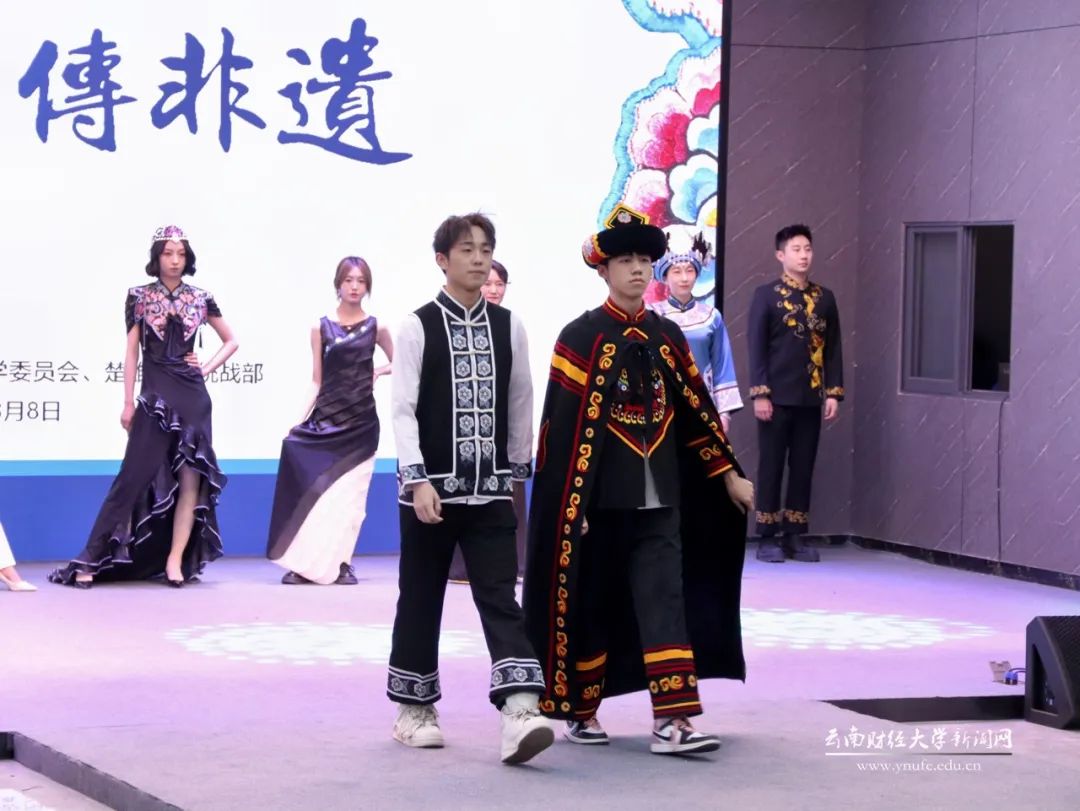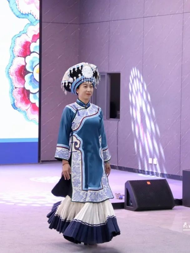 活动期间,由学校教职工和学生组成的模特队伍身着精美的彝绣服饰,以走秀的方式展现了彝族服饰的独特魅力。色彩浓烈、技法粗犷、配色大胆的彝族服饰,享有“绣在身上的神话,穿在身上的历史”美誉,是彝族儿女必不可少,热爱崇尚的节日盛装。相较于传统绣服,现场展示的彝绣服饰在色彩针法、款式、面料上进行了改良,兼顾传统和时尚、古老与现代,为师生们呈现了一场精彩的“T台”秀。