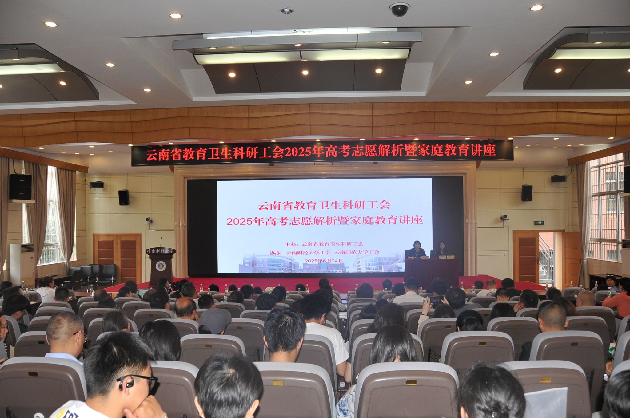 随着2025年高考落下帷幕,志愿填报成为考生和家长关注的焦点。为帮助他们科学规划志愿填报,6月24日,由云南省教卫科工会主办,十大买球官方网站工会、云南师范大学工会协办的“云南省教育卫生科研工会2025年高考志愿解析暨家庭教育讲座”在十大买球官方网站国际学术报告厅成功举办。云南省教卫科工会主席谢馨莹亲临活动现场,教卫科工会维权部部长刘洪波担任主持。讲座吸引了260多名来自教育科研卫生系统的干部职工和考生到场聆听,现场座无虚席,气氛热烈。