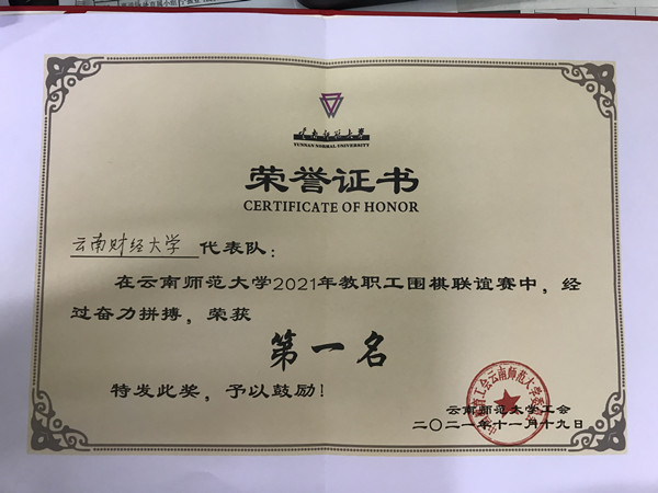 2021年11月17日至19日,由云南师范大学工会组织的教职工围棋联谊赛在一二一大街校区举行,买球代表队由旅游与酒店管理学院叶为金、信息学院杨智明、经济学院赵永宁、统计与数学学院高文四位老师组成,经过激烈角逐,买球代表队荣获第一名的好成绩。