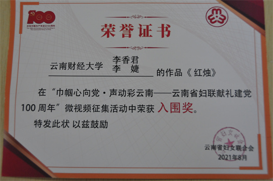 1、李香君 李婕 “巾帼心向党▪声动彩云南--云南省妇联献礼建党100周年”微视频入围奖云南省妇女联合会 2021年8月