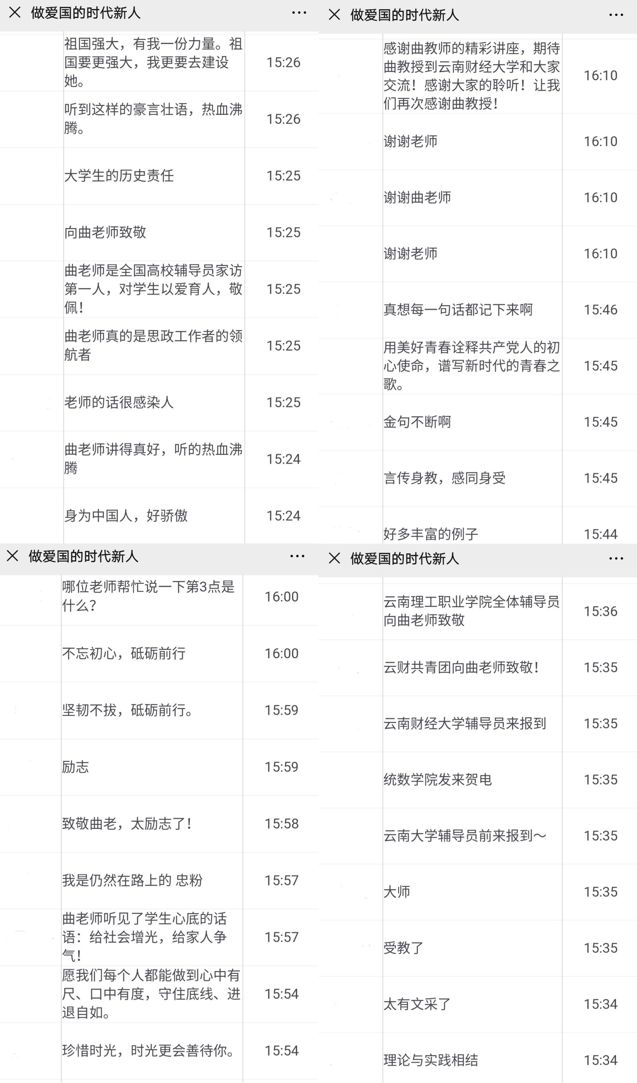 在开讲前,党委学生工作部、云南省高校辅导员发展研究中心(十大买球官方网站)还诚邀省内、外兄弟院校的辅导员老师们一同聆听讲座。讲座过程中,各校辅导员和同学们纷纷发弹幕表示曲老师的讲座很有感染力,听到这么好的思政课,大家热血沸腾。认为曲老师是辅导员的榜样,是思政工作的领航者,要学习曲老师对学生的以爱育人,把小我融入大我,在实现社会价值中体现自我价值的责任和担当,不忘初心,砥砺前行,报效祖国。