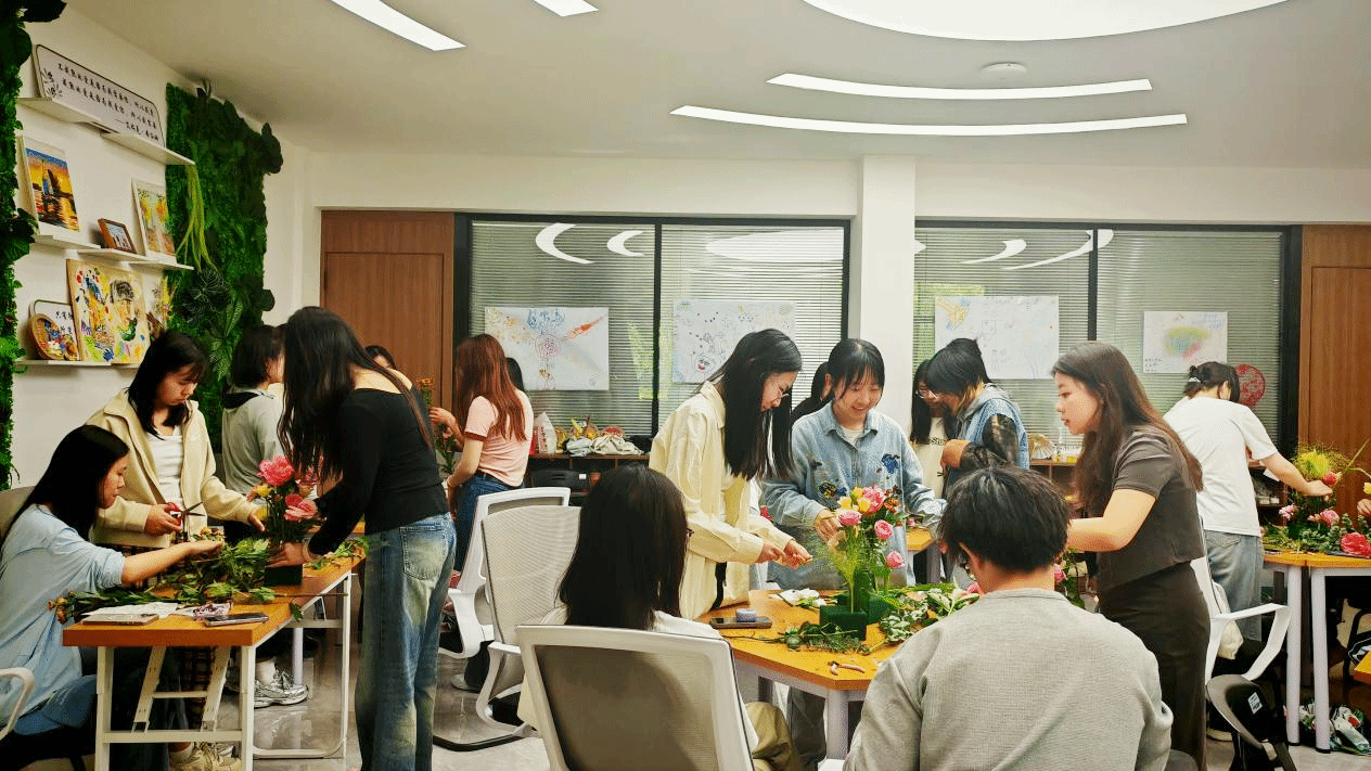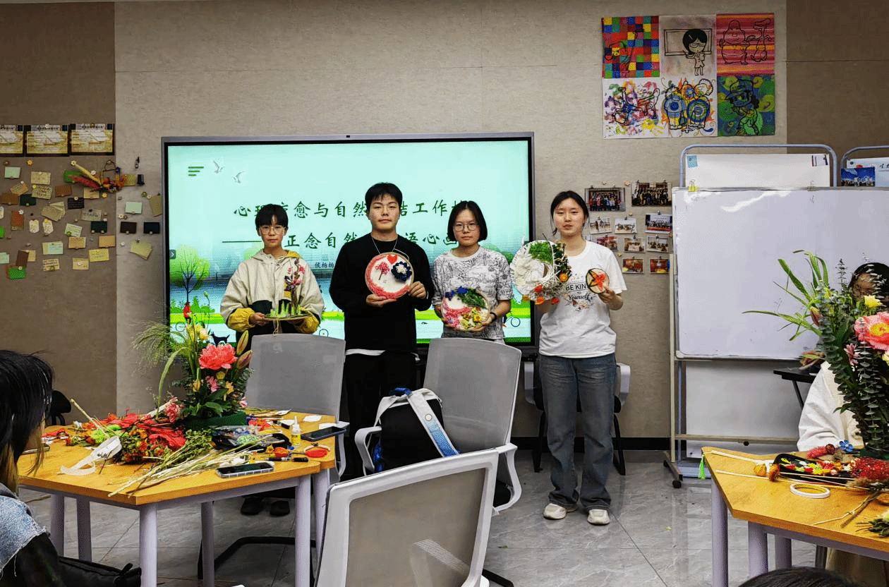 作为学校春季心理健康主题教育的特色项目之一,本次工作坊突破传统心理辅导模式,将正念放松、园艺疗法与表达艺术治疗创新融合,打造了具身化的疗愈场景。参与者通过多感官沉浸式体验,在专业老师指导下开展正念冥想、插花、花艺手工、合作共创等互动环节,在与自然的联结中觉察情绪、探索自我并缓解释放压力。新颖的艺术手工创作形式,不仅是“以美润心”的创新实践,更有助于同学们培育积极心理品质、提升心理健康素养。