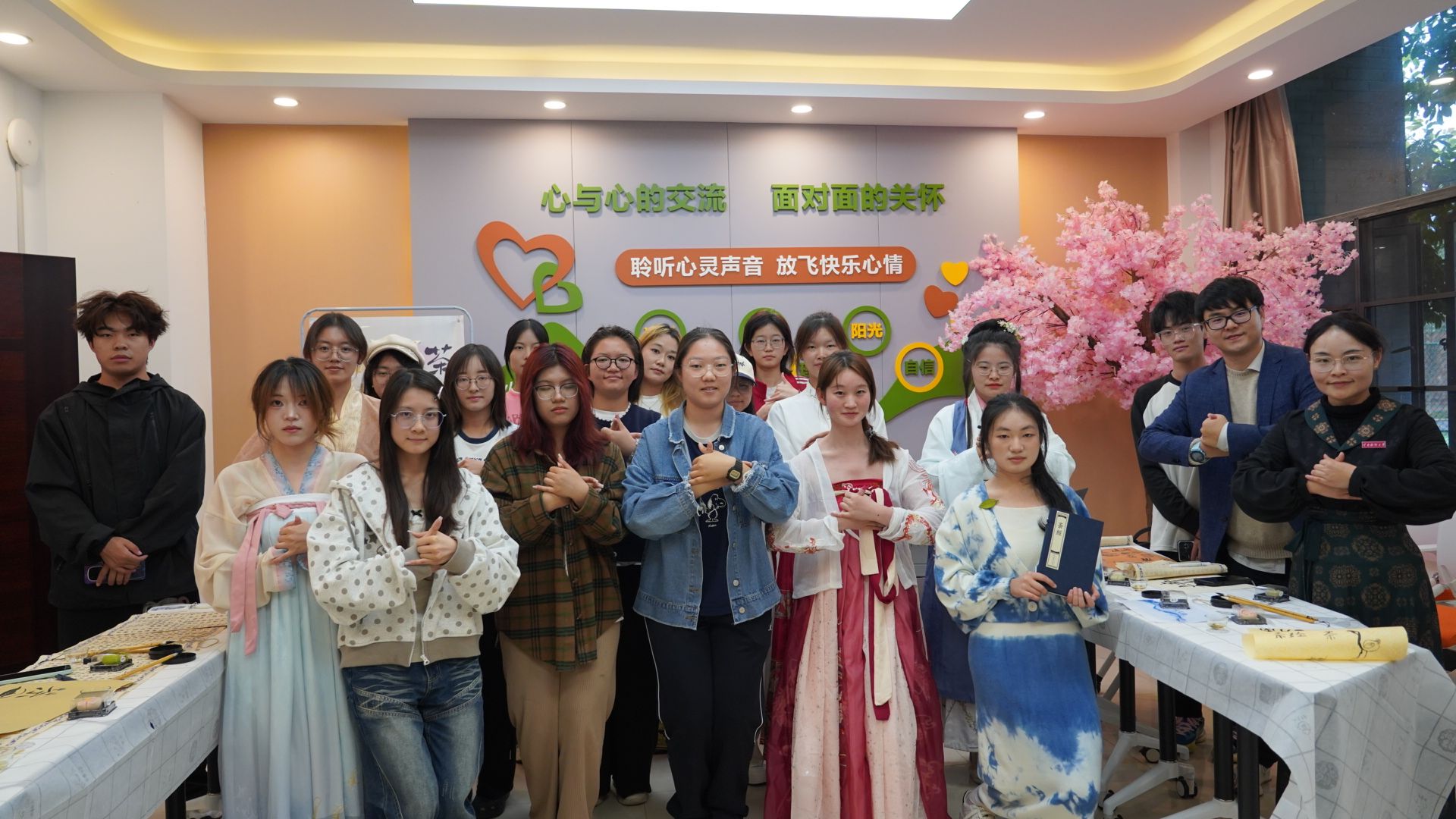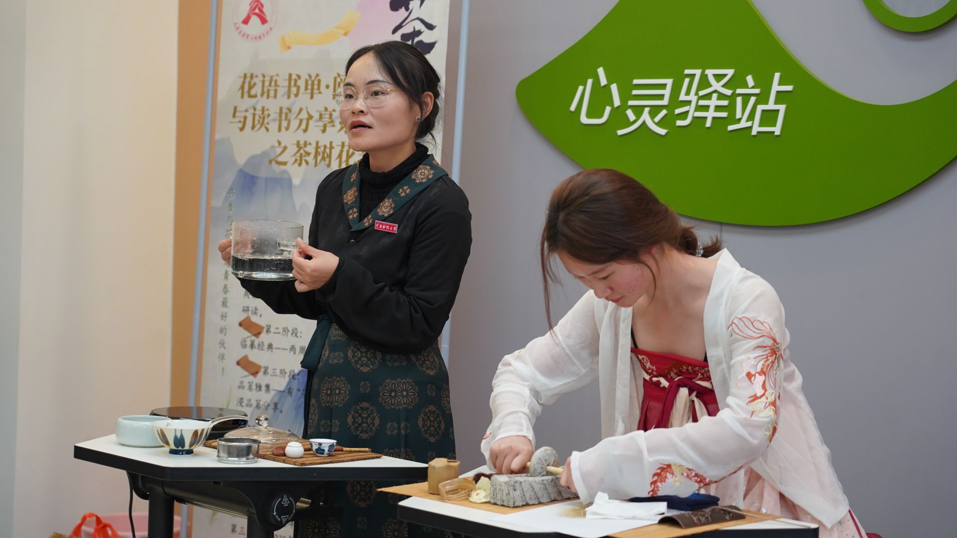 作为学校第六届“世界精神卫生日”系列活动之一,本期活动以“三进一出”倡议为框架,首创“文化+心理”双嵌入模式:将茶艺、阅读、抄写与心理疗愈结合,以茶为媒介,让同学们在点茶赏墨、华服茗香的雅集中体味静心之法,思悟修身哲学,实现传统文化与当代生活的诗意对话。