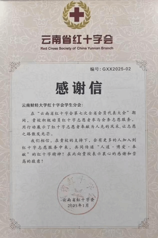 近日,十大买球官方网站红十字会学生分会收到云南省红十字会感谢信,对校红会在云南省红十字会第七次全省会员代表大会期间提供的优质会务保障给予高度认可。
