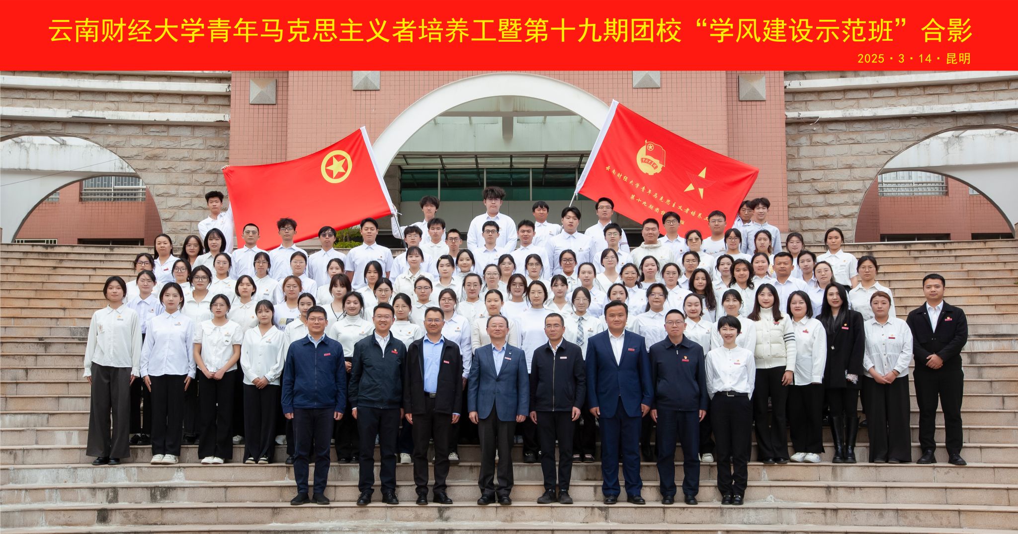 3月14日下午,十大买球官方网站青年马克思主义者培养工程•第十九期团校暨“学风建设示范班”开班仪式在龙泉路校区国际学术报告厅举行。学校党委书记陈红教授为云财青年开讲2025年春季学期“开学第一课”并为青马班首个“学风建设示范班”揭牌。