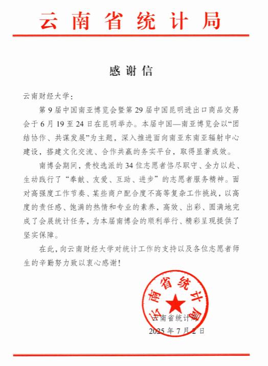 近日,省统计局向买球发来感谢信,向买球对第9届中国—南亚博览会暨第29届中国昆明进出口商品交易会的支持表示感谢,对买球志愿者给予高度赞扬。