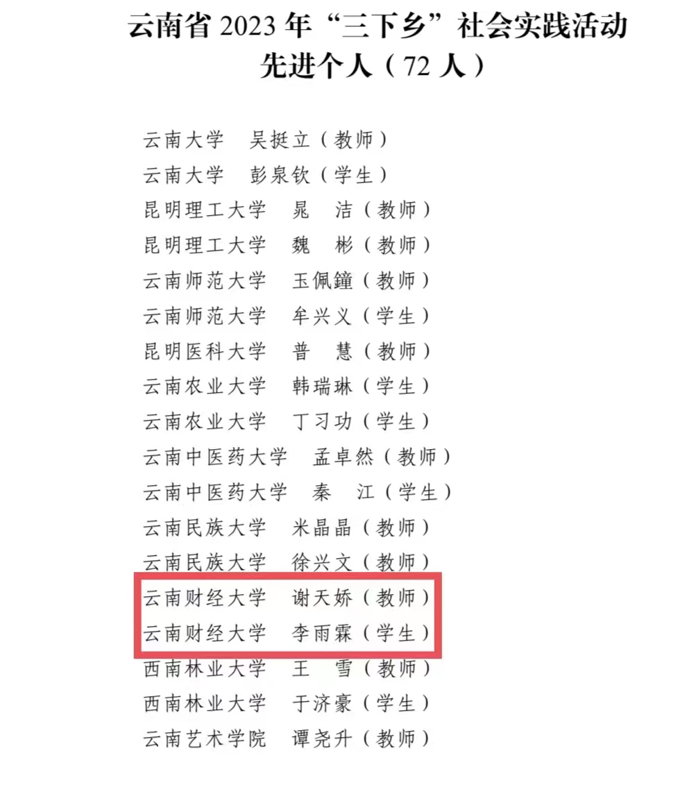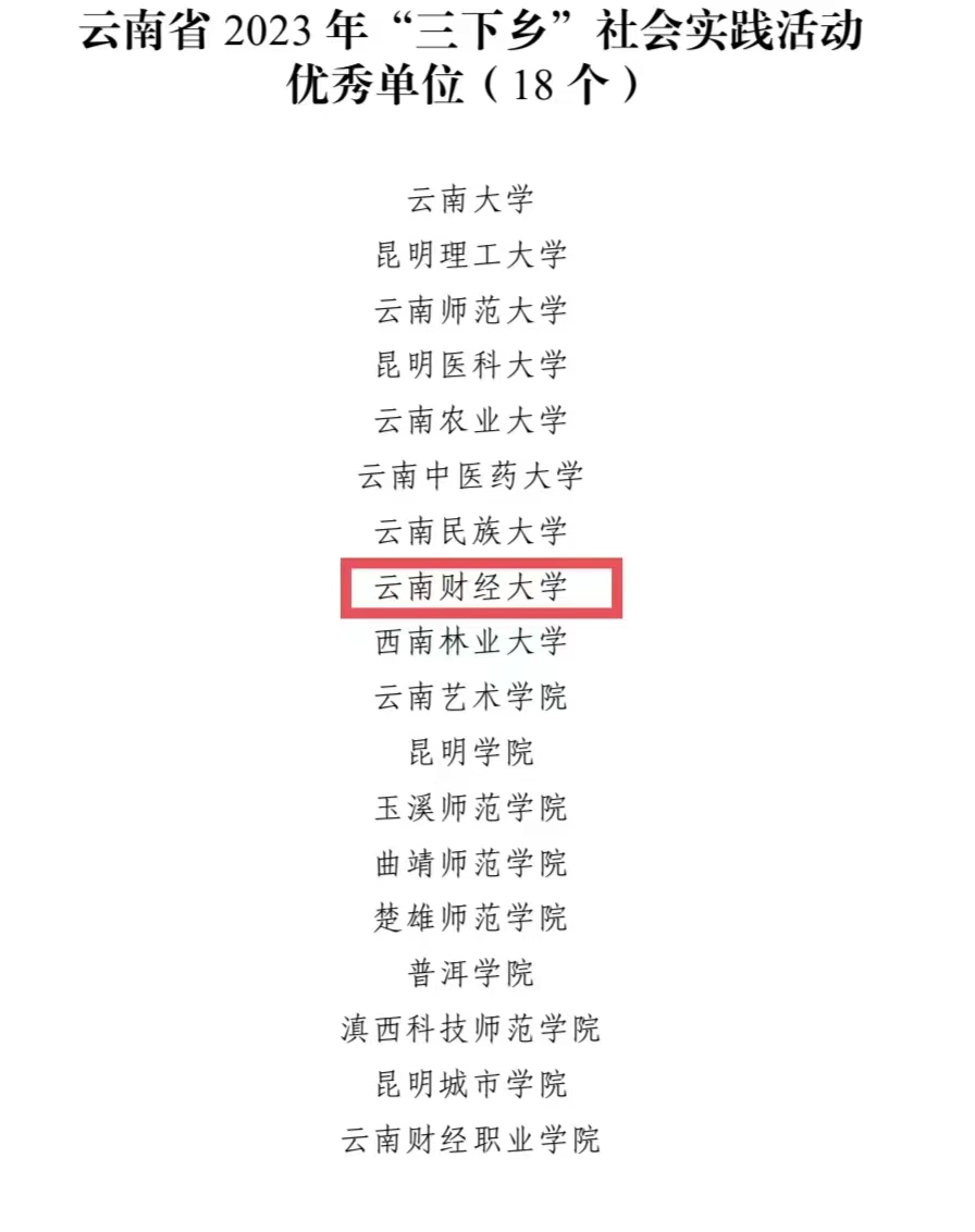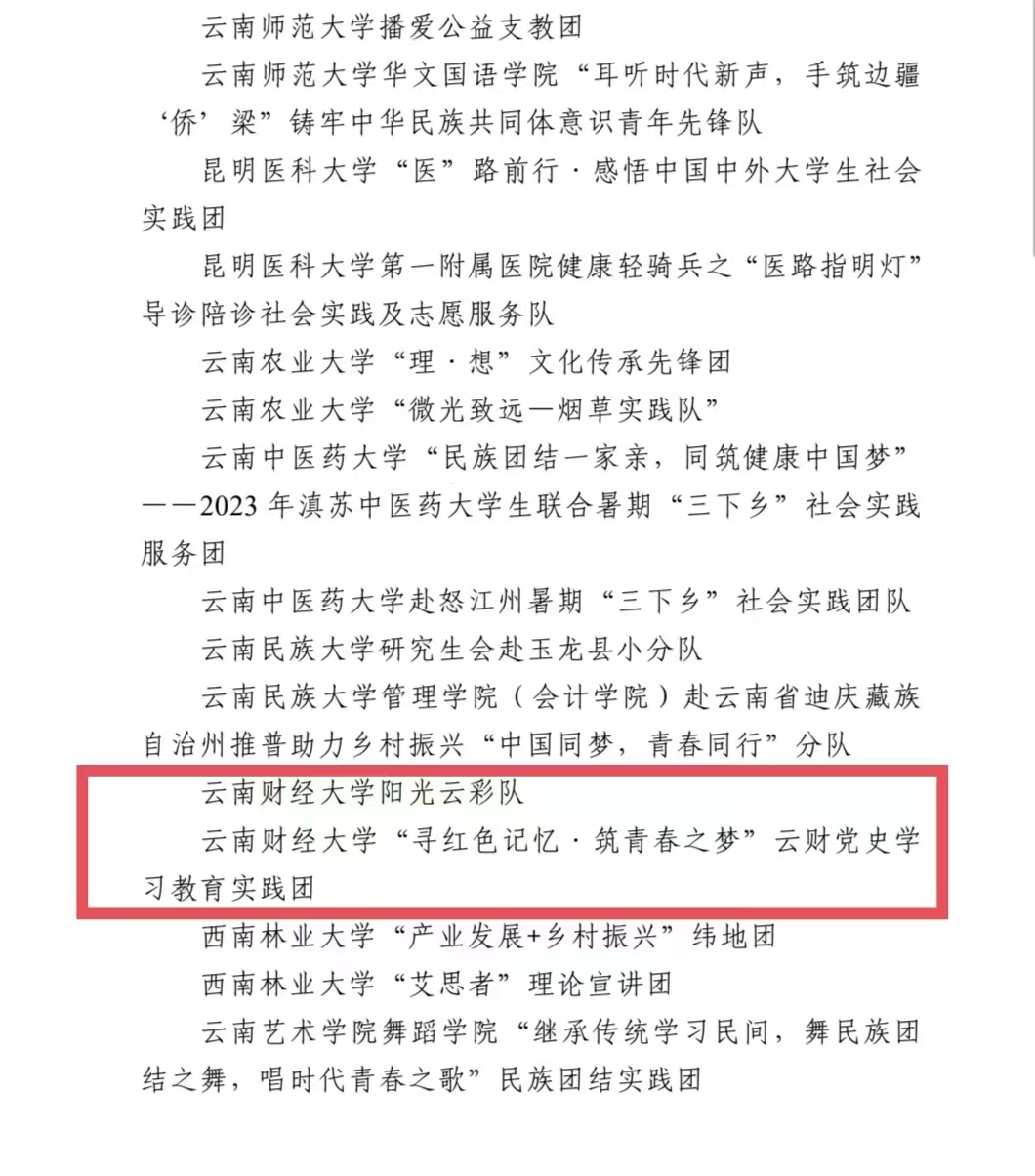 近日,共青团云南省委下发《关于2023年云南省大中专学生志愿者暑期文化科技卫生“三下乡”社会实践活动优秀单位、优秀团队、先进个人和特色品牌项目的公示》文件,买球荣获云南省2023年“三下乡”社会实践活动优秀单位;“十大买球官方网站阳光云彩队”、“十大买球官方网站‘寻红色记忆·筑青春之梦’云财党史学习教育实践团”两个团队荣获云南省2023年“三下乡”社会实践活动优秀团队;谢天娇老师和李雨霖同学荣获云南省2023年“三下乡”社会实践活动先进个人。