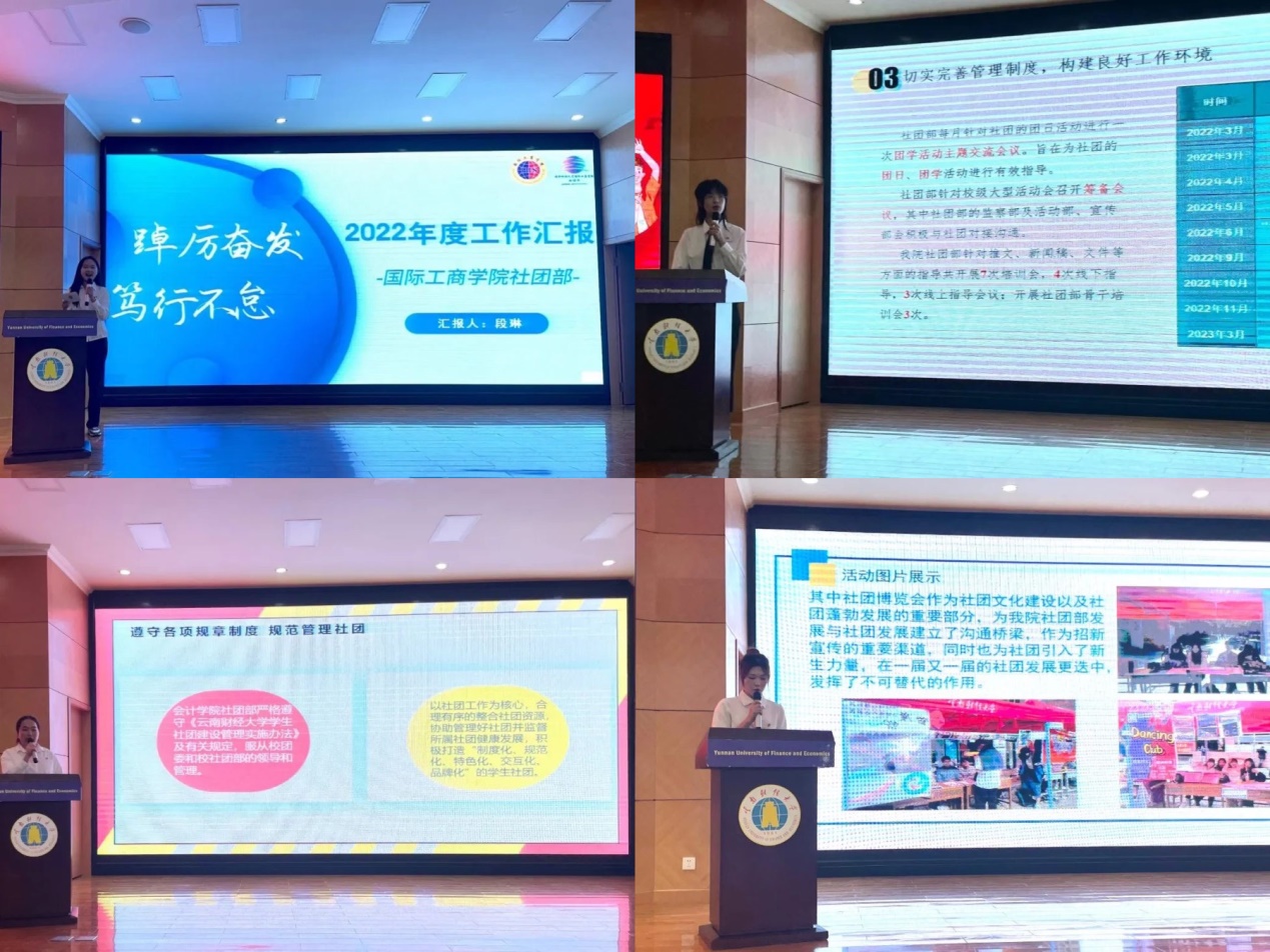 每家社团部负责人围绕“组织建设、团队建设、社会服务、社团风采、活动宣传、工作规划”六个方面轮流进行年度工作汇报,展示过去一年社团部的工作情况,最终会计学院、传媒与设计艺术学院、国际工商学院、物流与管理工程学院、中华职业学院被评为优秀学院社团部。