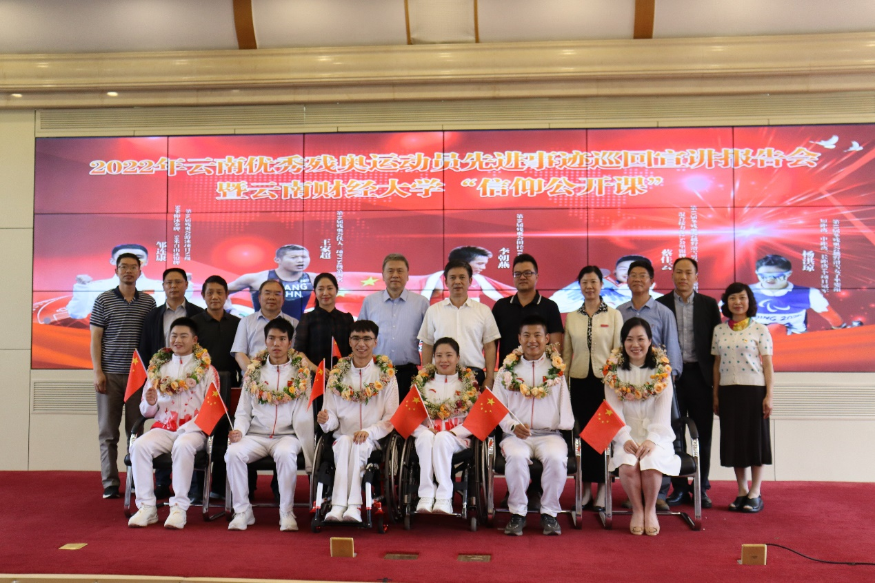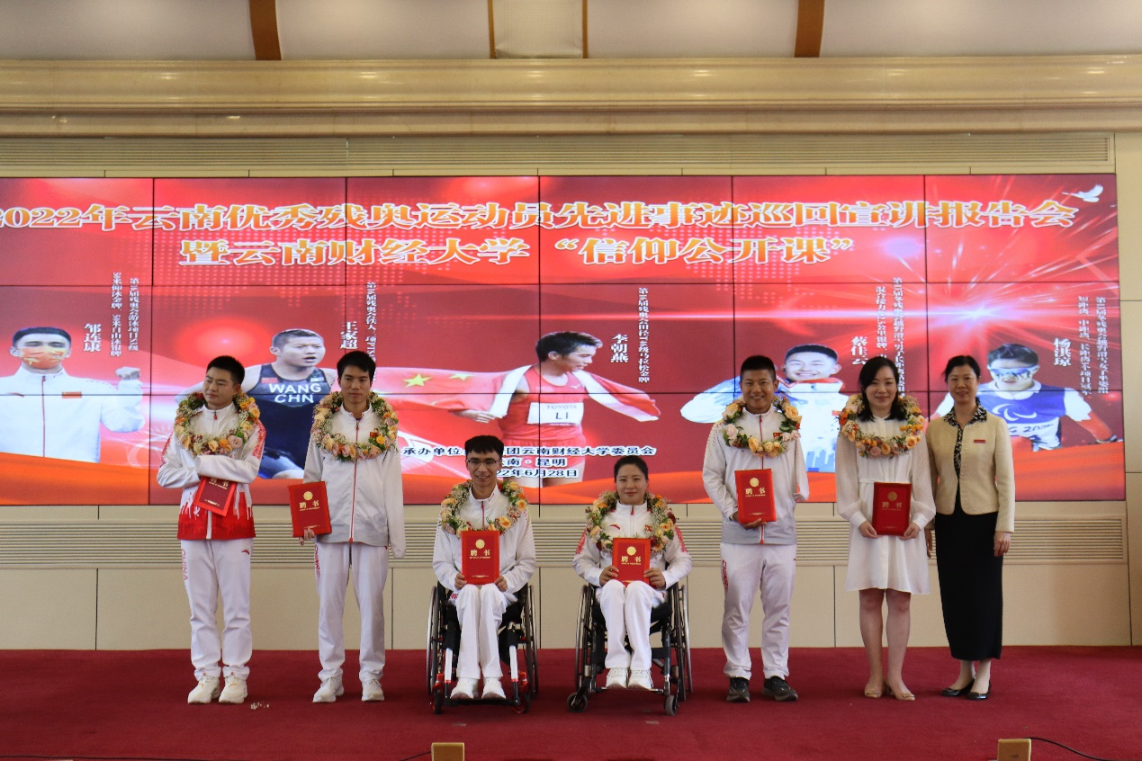 为弘扬奥运精神和残奥价值观,发挥先进模范的引领作用,引导广大云财青年跨越坎坷,铸造梦想,2022年云南优秀残奥运动员先进事迹巡回宣讲报告会暨十大买球官方网站“信仰公开课”于6月28日下午在学校国际报告厅开讲!云南省残联党组书记、理事长赵正富,学校党委副书记、校长王敏出席活动并讲话。团省委副书记段胜忠,省妇联副主席杨正梅,省教育厅二级巡视员何开喜,省委宣传部副处长罗兴,省体育局处长刘凡,省残联主任王维进,省总工会一级调研员 王留德,省广电局处长黄俊党委委员、副校长王晓萍,学校党委委员、宣传部部长徐宝春,学生处副部长赵莎娜,校团委副书记李昀璟与师生共同聆听宣讲。
