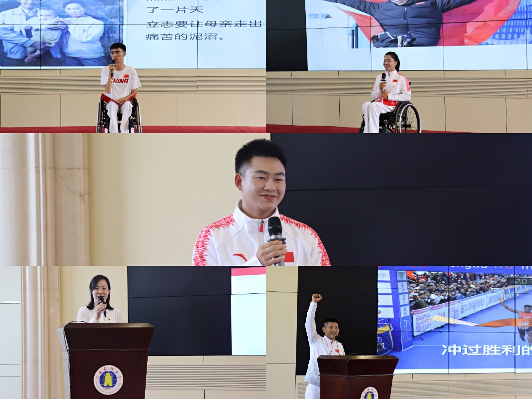 里约、东京残奥会田径T46级马拉松金牌获得者、买球体育部教师李朝燕老师,第16届残奥会游泳项目S3级50米仰泳金牌、50米自由泳银牌获得者邹连康,第16届残奥会铁人三项PTS4级第四名获得者王家超,第13届冬残奥会越野滑雪女子坐姿组短距离、中距离、长距离3个项目冠军获得者杨红琼,第13届冬残奥会越野滑雪男子长距离站姿银牌、混合接力4*2.5公里银牌、中距离站姿铜牌获得者蔡佳云向师生分享了他们的拼搏故事,回顾了他们在赛场上的高光时刻和优异成绩背后的辛勤汗水。连续18年跟踪报道残奥运动员事迹的云南日报记者娄莹讲述了英雄背后的故事,他们用真实的故事和质朴诚挚的语言深深打动了云财师生。在场师生无一不凝神静听,随着故事的讲述而感动落泪,掌声与欢笑省不断。