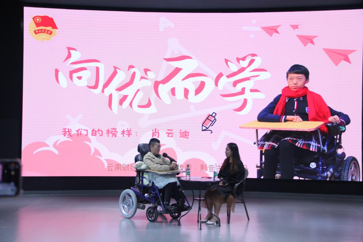 为展现云财青年风采,向先进学习,向榜样看齐,12月9日晚,校团委品牌活动“向优而学”邀请到买球2021级经基班肖云迪同学来到路演大厅和同学们面对面分享她的成长之路。