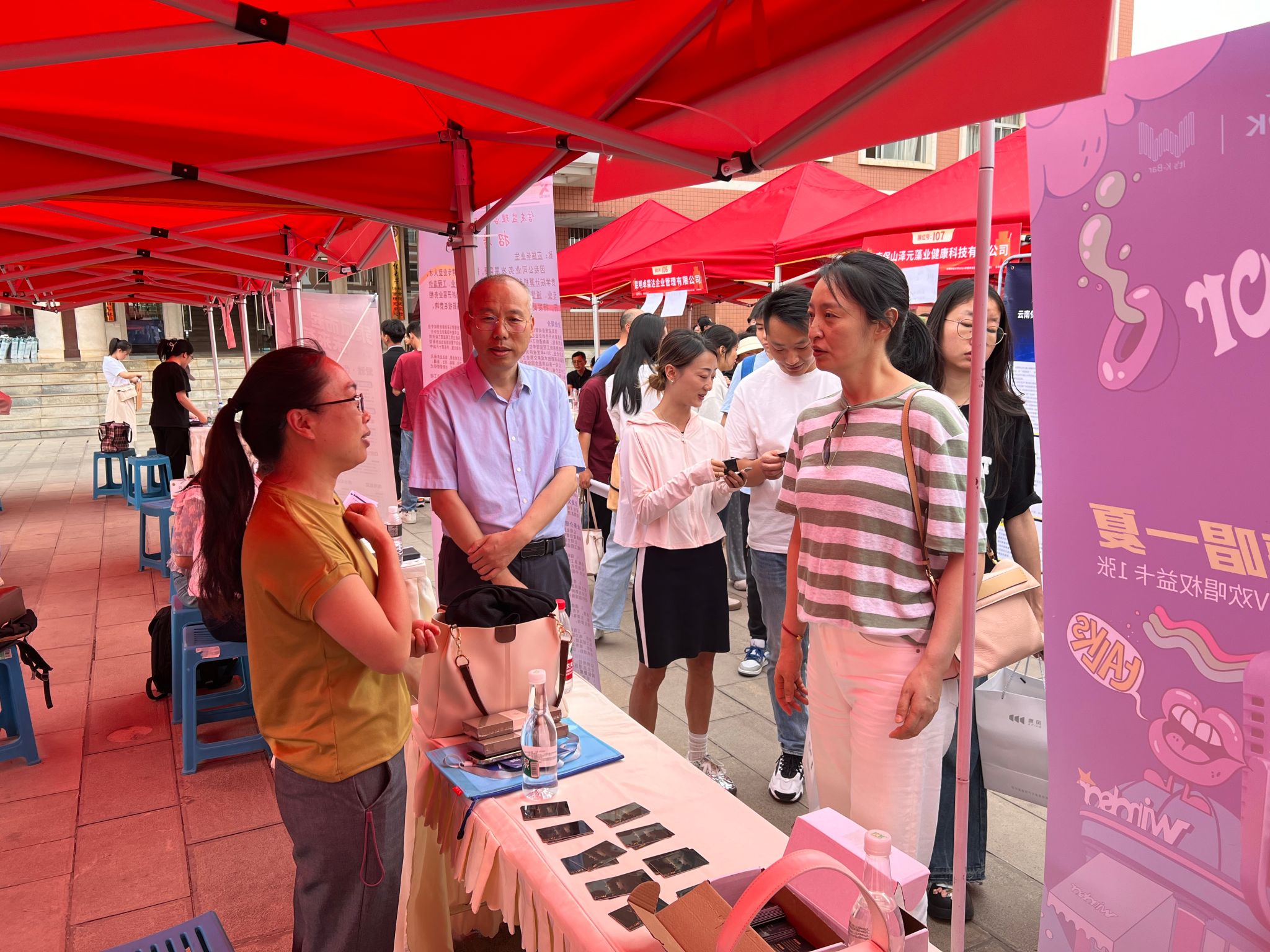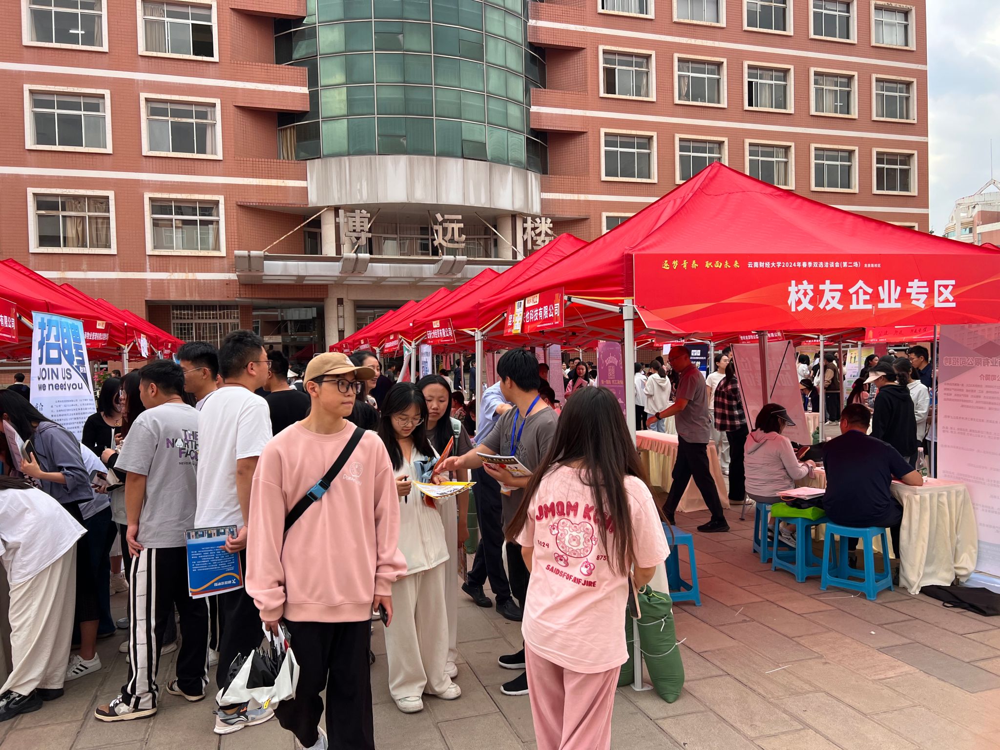 4月30日下午,十大买球官方网站“逐梦青春,‘职’面未来2024年春季双选洽谈会”在龙泉校区南院新阳广场举行。本次招聘会设校友企业专区,云南东骏药业有限公司、云南朗坤数字农业有限公司等20多家校友企业应邀参会,涵盖数字农业、生物科技、文化艺术、教育等多个行业,提供就业岗位200余个。