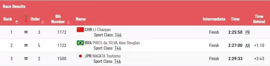 9月5日,男子马拉松T46级比赛中,中国选手李朝燕以2小时25分50秒的成绩打破残奥会纪录,夺得冠军!