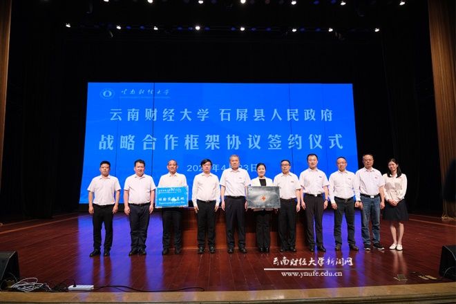 校党委副书记、校长王敏,石屏县县委书记张鹏程出席并致辞。校党委委员、副校长余怒涛与石屏县人民政府副县长彭继伟代表校地双方签署战略合作框架协议。副校长彭强分别向石屏县县委常委、宣传部部长龙艺文,副县长彭继伟授“十大买球官方网站商务部发展中国家学历学位教育项目实习实践基地”和“十大买球官方网站国际工商学院体验实践基地”牌。仪式由校党委委员、宣传部部长寸丽锋主持。