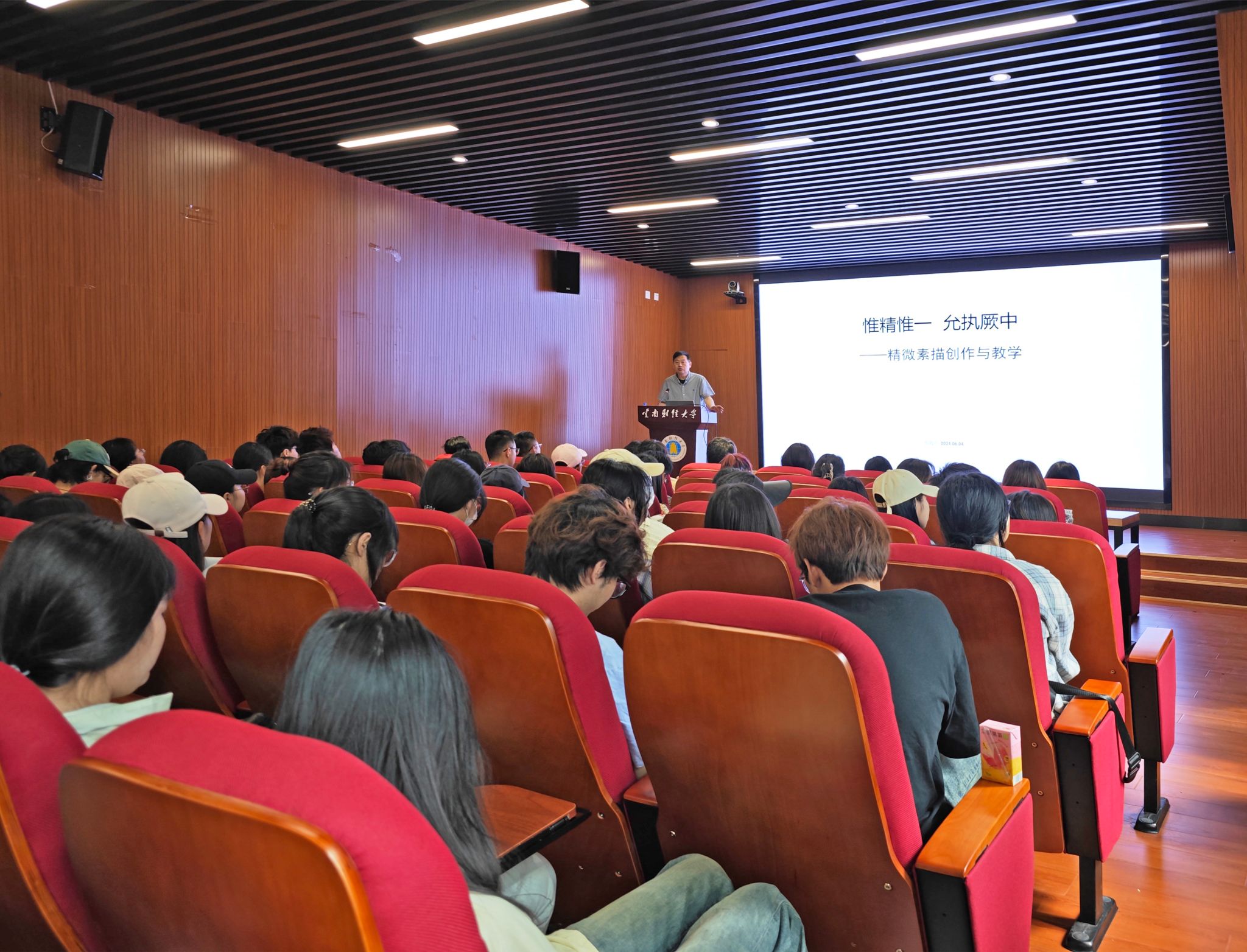 6月4日上午,作为此次活动内容之一的学术讲座在传艺学院报告厅举行,中央美术学院动画专业方向学术带头人、博士生导师苏海江教授为师生带来主题讲座《“惟精惟一,允执厥中”—精微素描创作与教学》,分享了在创作过程中素描创作与教学方面的实践经验。