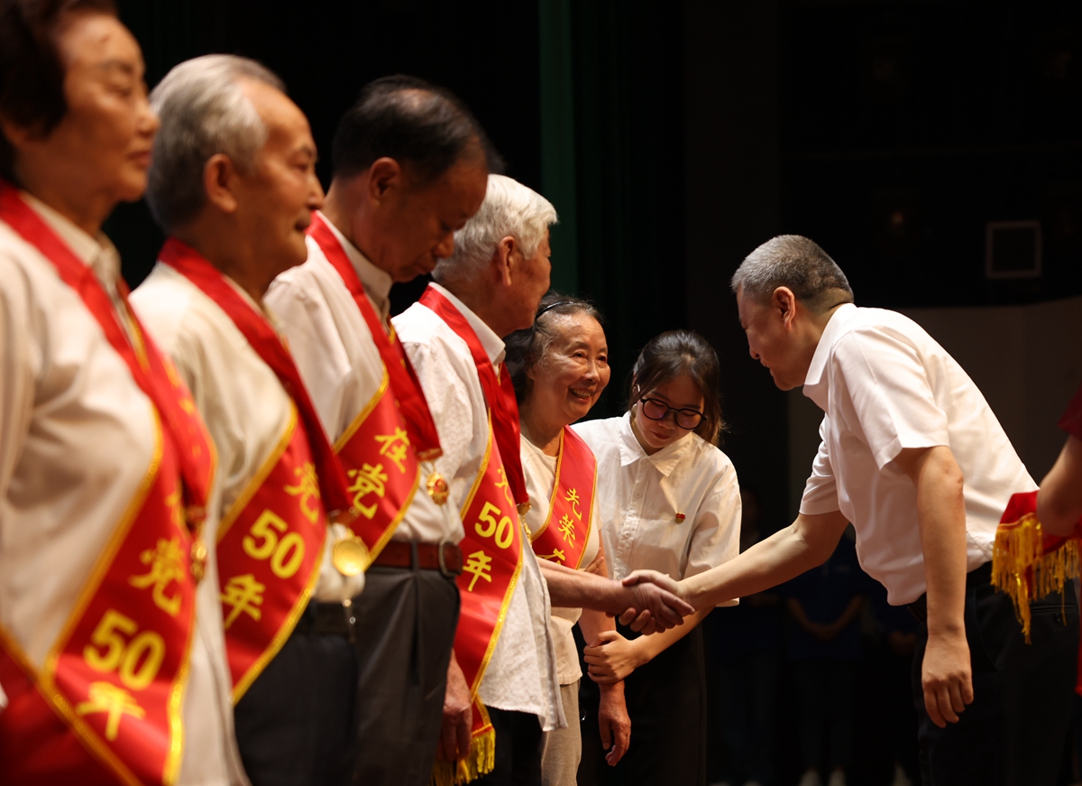 大会在庄严的国歌声中拉开帷幕,面向鲜红的党旗,240名新党员代表举行了宣誓仪式,老党员们共同重温了入党誓词。王敏向“光荣在党50年”老党员颁发纪念章,全场起立鼓掌向老党员们致敬。