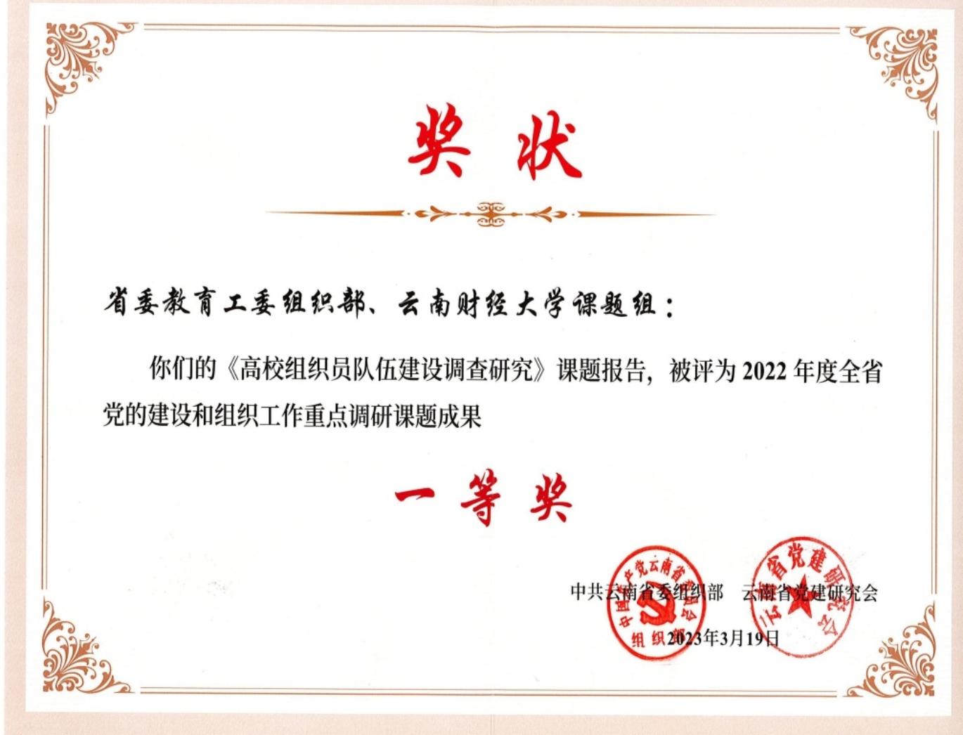 近日,中共云南省委组织部、云南省党建研究会公布2022年度全省党的建设和组织工作重点调研课题获奖结果。由省委教育工委组织部和十大买球官方网站共同完成的《高校组织员队伍建设调查研究》课题报告获评一等奖,课题结题评定等次为“优秀”。3月31日,云南省党建研究会召开第六届理事会第四次全体会议,对2022年度全省党的建设和组织工作重点调研课题进行了表彰。