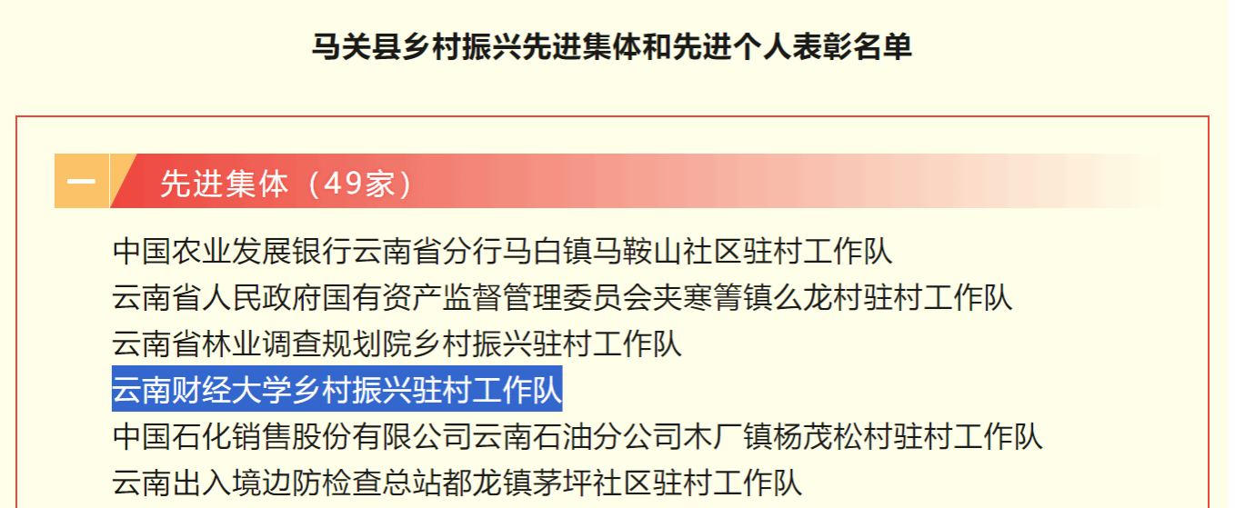 5月22日,马关县乡村振兴先进集体和先进个人表彰名单公示,十大买球官方网站乡村振兴驻村工作队获评“先进集体”,2月19日,学校10名驻村工作队员中4名考核结果为“优秀”。